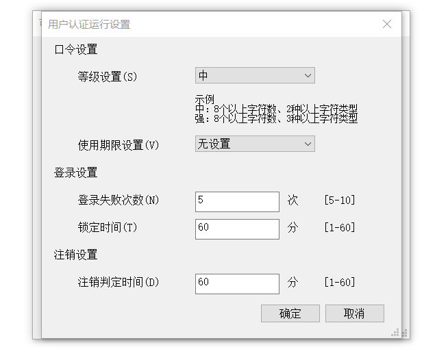 1.等級(jí)設(shè)置:可以規(guī)定口令的強(qiáng)度等級(jí)。(中:2種字符;強(qiáng):3 種字符)