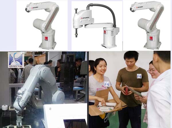 (圖為我司三菱機器人產(chǎn)品以及工作人員向顧客熱情解說我司三菱原裝機器人產(chǎn)品)
