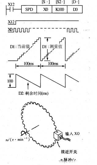 速度檢測(cè)指令SPD的編號(hào)為FNC56。它的功能是用來(lái)檢測(cè)給定時(shí)間內(nèi)從編碼器輸入的脈沖個(gè)數(shù),并計(jì)算出速度。如圖5所示,[D. ]占三個(gè)目標(biāo)元件。當(dāng)X12為ON時(shí),用D1對(duì)X0的輸入上升沿計(jì)數(shù),100ms后計(jì)數(shù)結(jié)果送入D0,D1復(fù)位,D1重新開(kāi)始對(duì)X0計(jì)數(shù)。D2在計(jì)數(shù)結(jié)束后計(jì)算剩余時(shí)間。