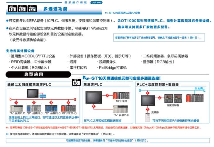 回答:可以。三菱的觸摸屏 GOT1000 系列中的 GT11/15 系列都可以直接連接歐姆龍、神港技術(shù)、Chino、富士、山武等品牌的溫度調(diào)節(jié)器/指示調(diào)節(jié)計(jì),可以直接連接三菱電變頻