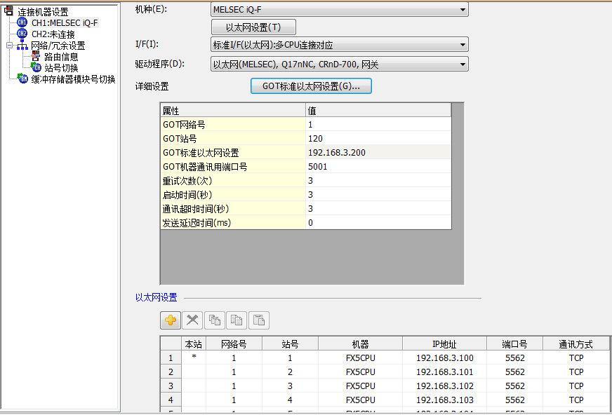 1:三菱觸摸屏IP地址設(shè)置、站號設(shè)置,連接三菱FX5U系列PLC的IP地址設(shè)置、站號設(shè)置,保證處于同一個網(wǎng)絡(luò),站號不同即可。