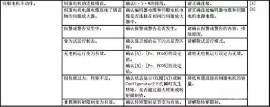 (下表對(duì)應(yīng)MR-JE系列伺服放大器,更多伺服放大器故障排查方法請(qǐng)參考相應(yīng)的伺服放大器技術(shù)資料集(故障排除篇))